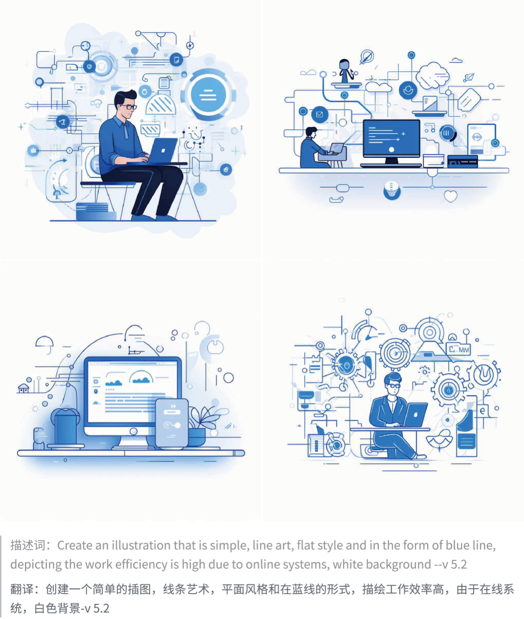线条插画视觉更加轻量化,给人亲切感,这种风格很简约也比较精致,你能把画面刻画的很详细。所以如果你的产品类型是很强的功能属性,不如试试线条艺术风格,记得在描述词里不要忘记加上「Line Art」