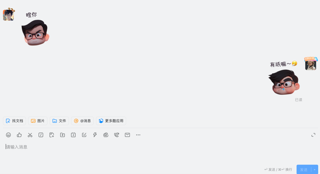 最后把图片切分好单个保存成 png 格式(记得要控制图片大小),导入钉钉聊天框,右键保存成表情。然后就可以在聊天的过程中愉快的使用起来啦!