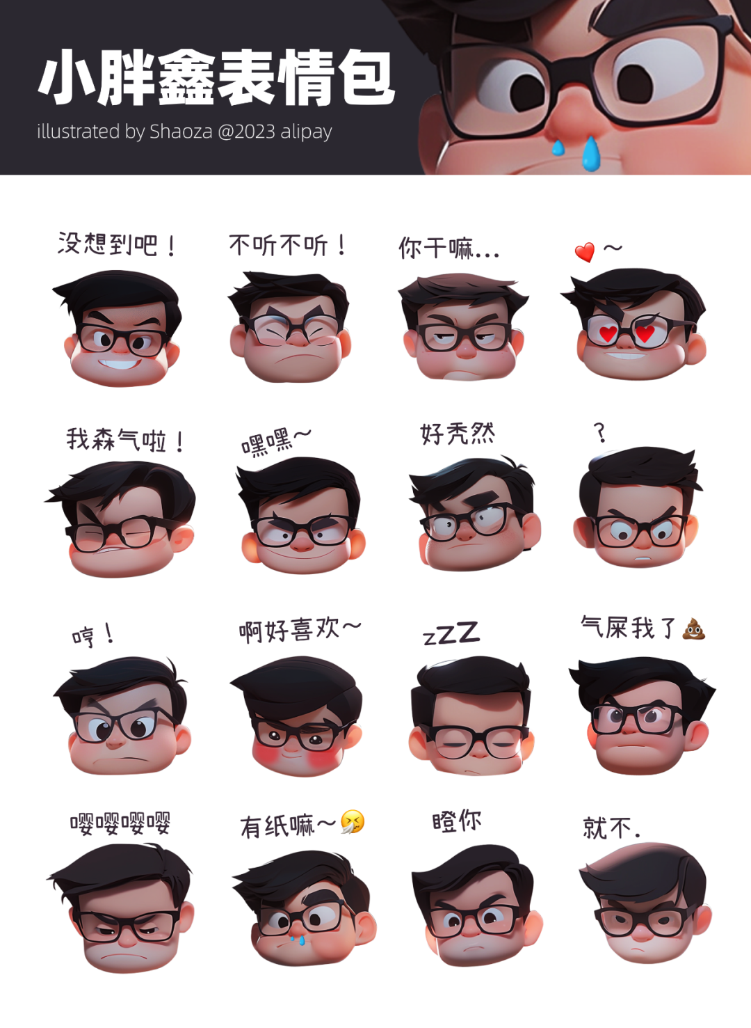 BTW 这套表情因为我输入的数字人小胖鑫不是很开心,因此后面炫出来的一系列图片大都是不太高兴的样子,为了保持表情包的丰富性,后续又用 ps 绘图软件又做了处理,比如把下垂的嘴角调整成上扬这种 🙃