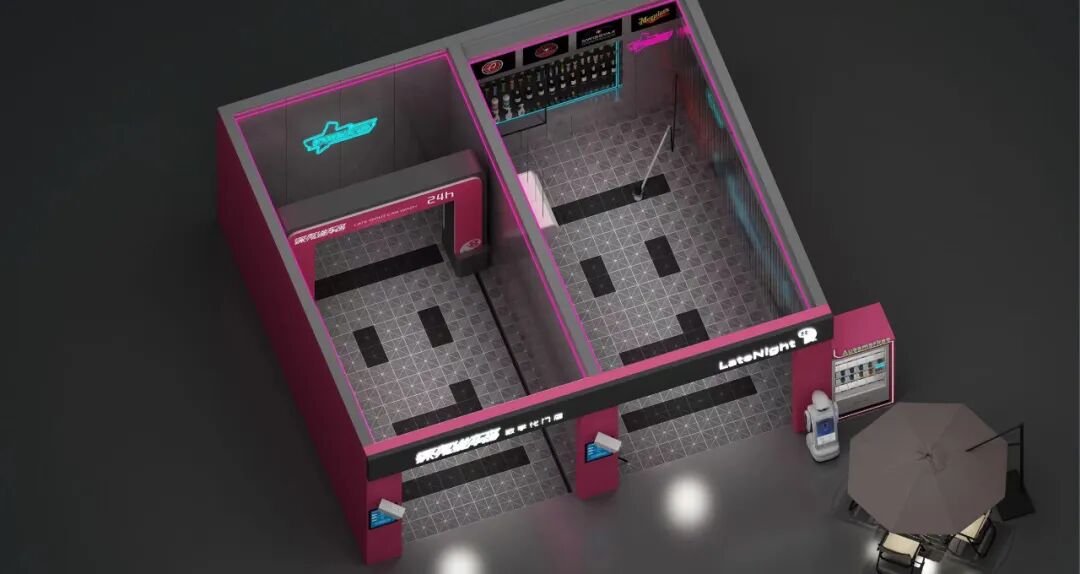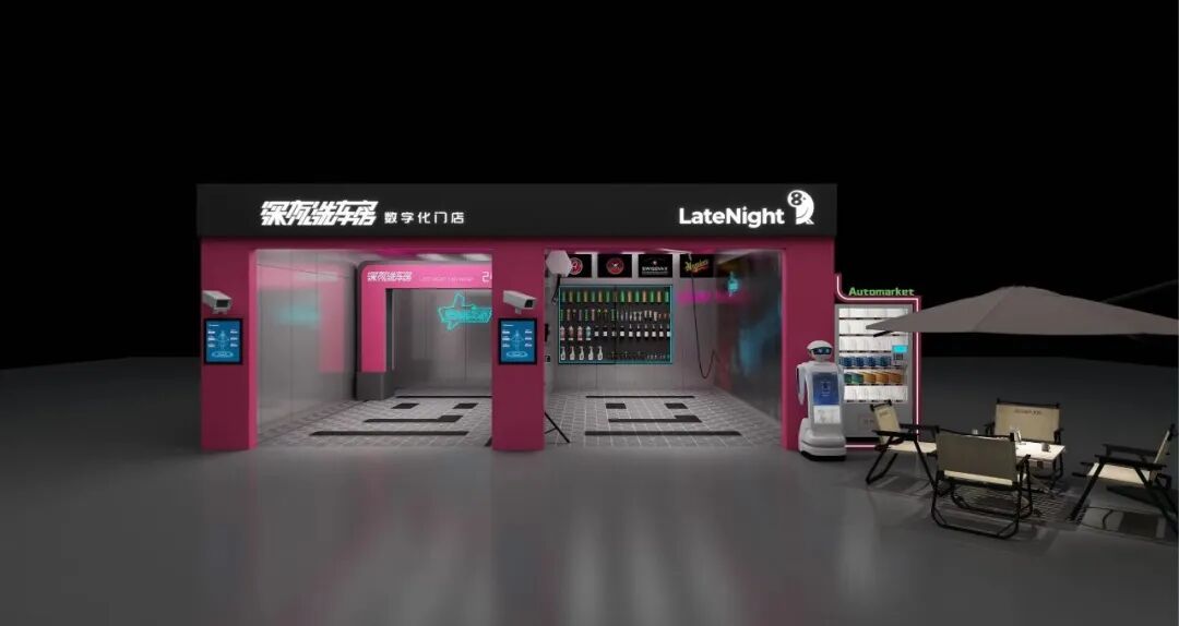 “去年我们把这些配套项目都送人了,公司全面转向拓展小型加盟店,在加盟店上砍掉一切综合服务,专注做洗车这件事。” 张良说。在门店的规划上,张良将一部分直营店转让给投资者做加盟,并计划未来直营店和加盟店的比例要达到5:95,这样一来可以高效地节省运营时间,二来可以加速产品的研发和创新。根据深夜洗车房的招商手册,加盟有两种方式,一种是总包加盟,深夜提供场地并负责整店装修、开业设备耗材等,视门店规模大小收取30到60万元。另一种是纯加盟,一次性加盟费9.9万元,深夜提供选址、培训、运营及持续督导等服务。如果加盟商需要线上渠道代运营和市场投放,还需要向深夜额外缴纳代运营费用和市场代投放费。今年,张良重新梳理了深夜洗车房的定位,之前面向的是中高收入人群,“现在我们的定位是面向普通老百姓的智能化基础服务。”深夜洗车房最新推出的深夜mini门店模型,装修风格是红黑色调的潮流宇宙风,门店内有两个洗车工位,一个是配备半自动洗车设备的快洗工位,另一个是可以拍照打卡的精洗工位,门店还配有负责销售的引导机器人和自动餐饮贩卖机。![]()