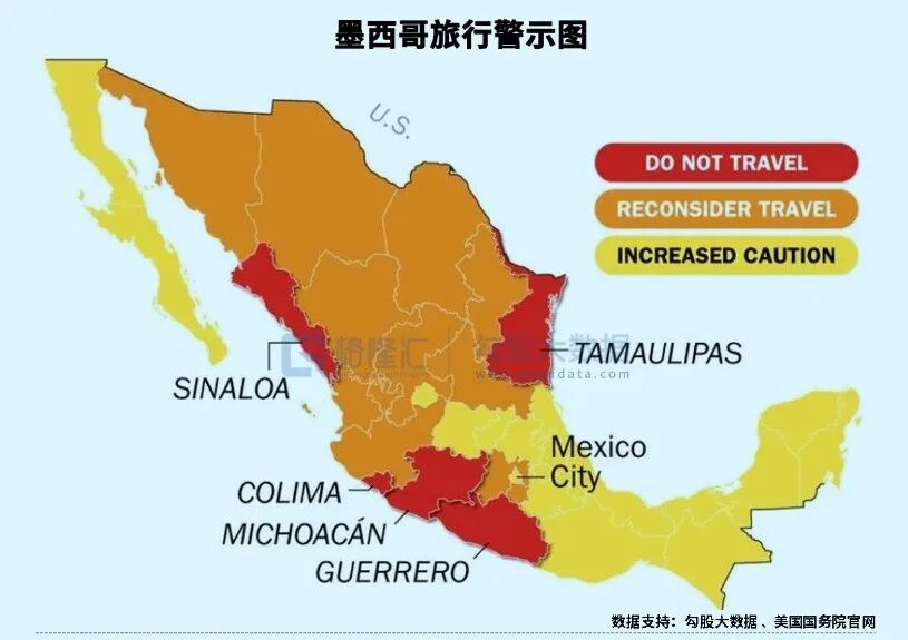下面是美国政府发布的墨西哥旅行预警地图。