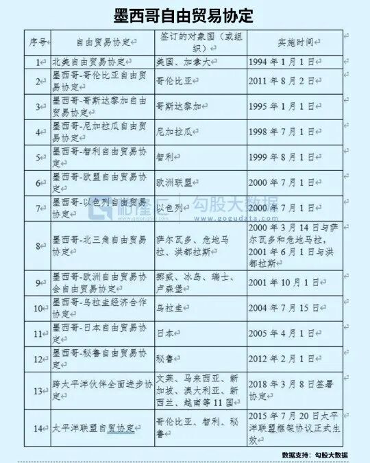 目前,除了《美墨加贸易协定》,墨西哥已与52个国家签订了14项自由贸易协定、32项互相促进和保护投资协定、9项经济互补自贸协定。