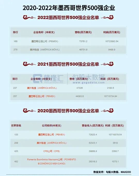2022年,墨西哥有两家企业上榜世界500强,分别是美洲电信和墨西哥石油。