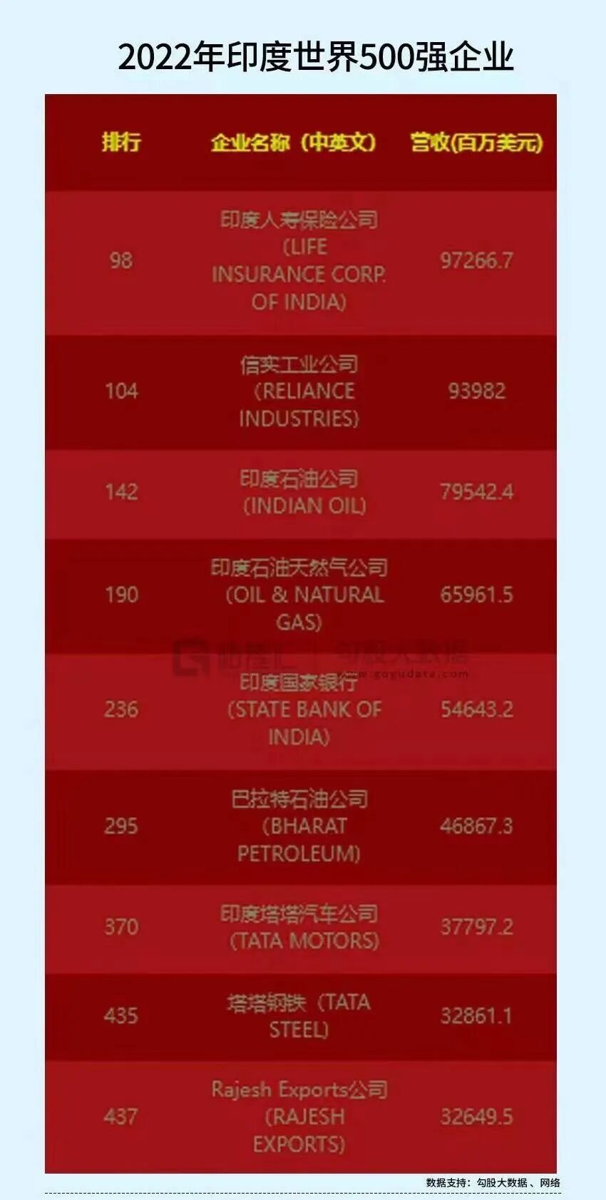 同样是2022年的500强名单,印度第二名是信实工业,第五是印度国家银行,第七是塔塔汽车,第八是塔塔钢铁。