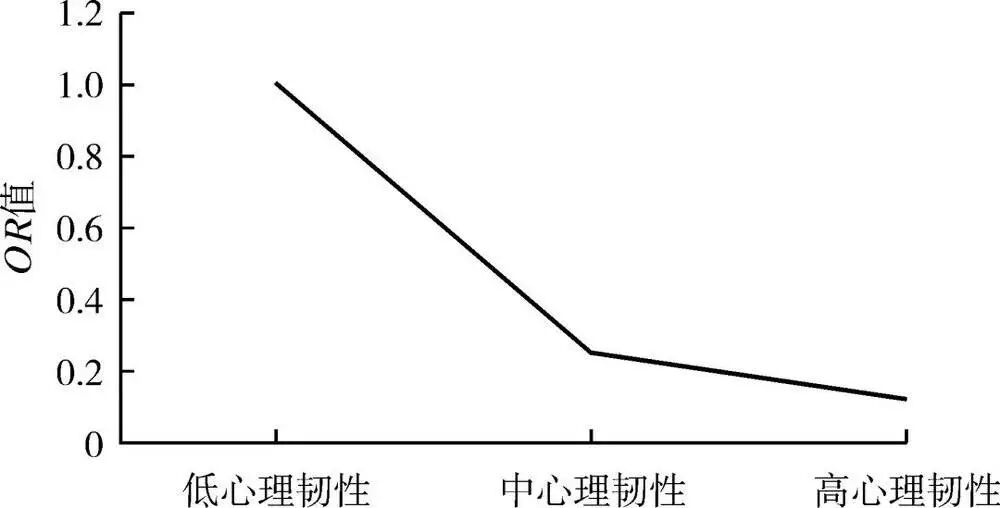 ▷ Logistic 回归结果:中等心理韧性的个体出现情绪困扰的可能性是低心理韧性个体的 0.25 倍,高心理韧性个体出现情绪困扰的可能性是低心理韧性个体的 0.12 倍(横坐标为心理韧性,纵坐标为情绪困扰)