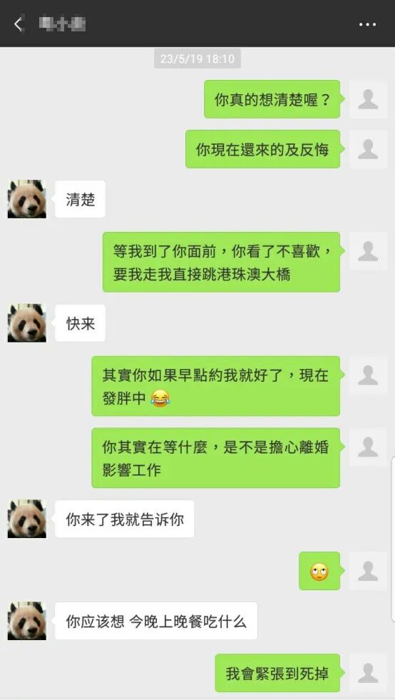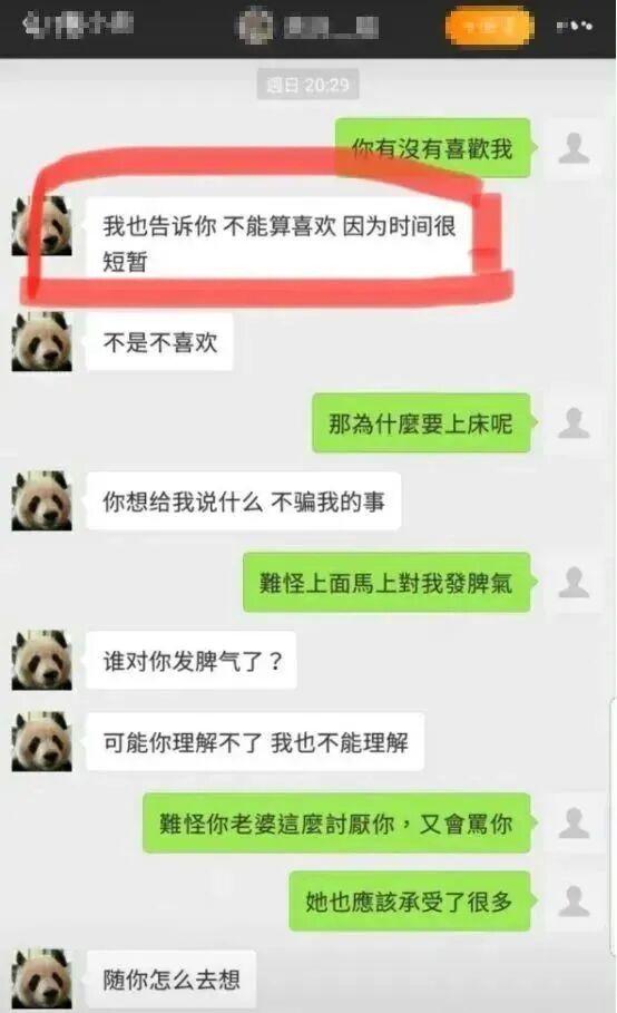 在人们爱屋及乌的追捧下,“发箍奶爸”拥有大量粉丝,还上过中央电视台。一个对熊猫宝宝如此温暖、如此体贴、如此周到的男饲养员,一定是个靠谱温煦的男人吧。当你丢掉思辨,用“一定”的武断,去看人看事时,很容易被打脸。因为熊猫是熊猫,饲养员是饲养员,人性是人性,修行是修行。今年5月份,她和“发箍奶爸网上认识后,在澳门约见,并发生了一夜情。发生关系后,她追问“发箍奶爸”是不是喜欢自己,结果