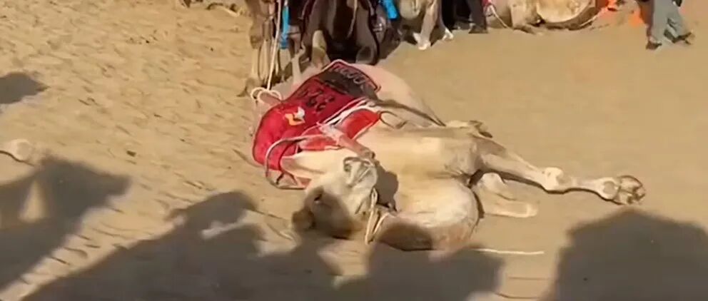 据前述网传视频显示,一只骆驼倒在沙地里已经无法站立,另有骆驼倒地后持续发出惨叫声,仍被迫拉起,旁边有不少游客正在排队等待。