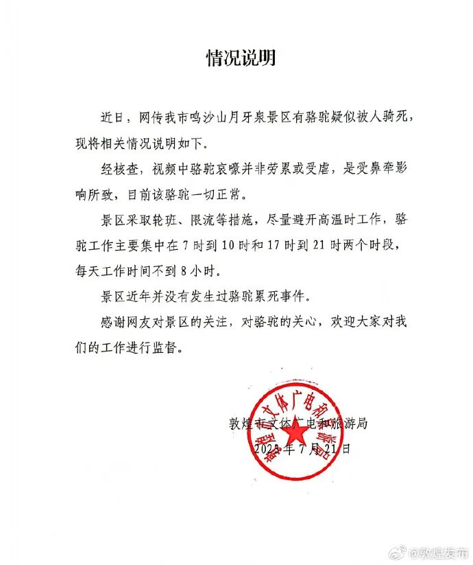 近日,网传我市鸣沙山月牙泉景区有骆驼疑似被人骑死,现将相关情况说明如下。