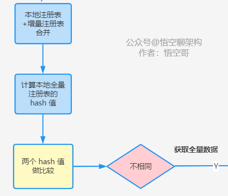 客户端将本地注册表 + 增量注册表进行合并。合并完成后,计算一个 hash 值,和 Server 返回的 hash 值进行比对,如果相等,则说明客户端的注册表和注册中心的注册表一致,同步完成。如果不一致,则还需要全量拉取一次。