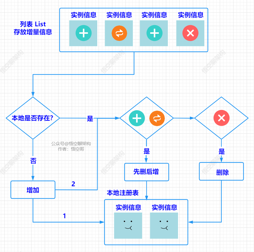这里有个问题:客户端首次拿到的全量注册表,存放本地了。第二次拿到的是增量的注册表,怎么将两次的数据合并在一起呢?如下图所示: