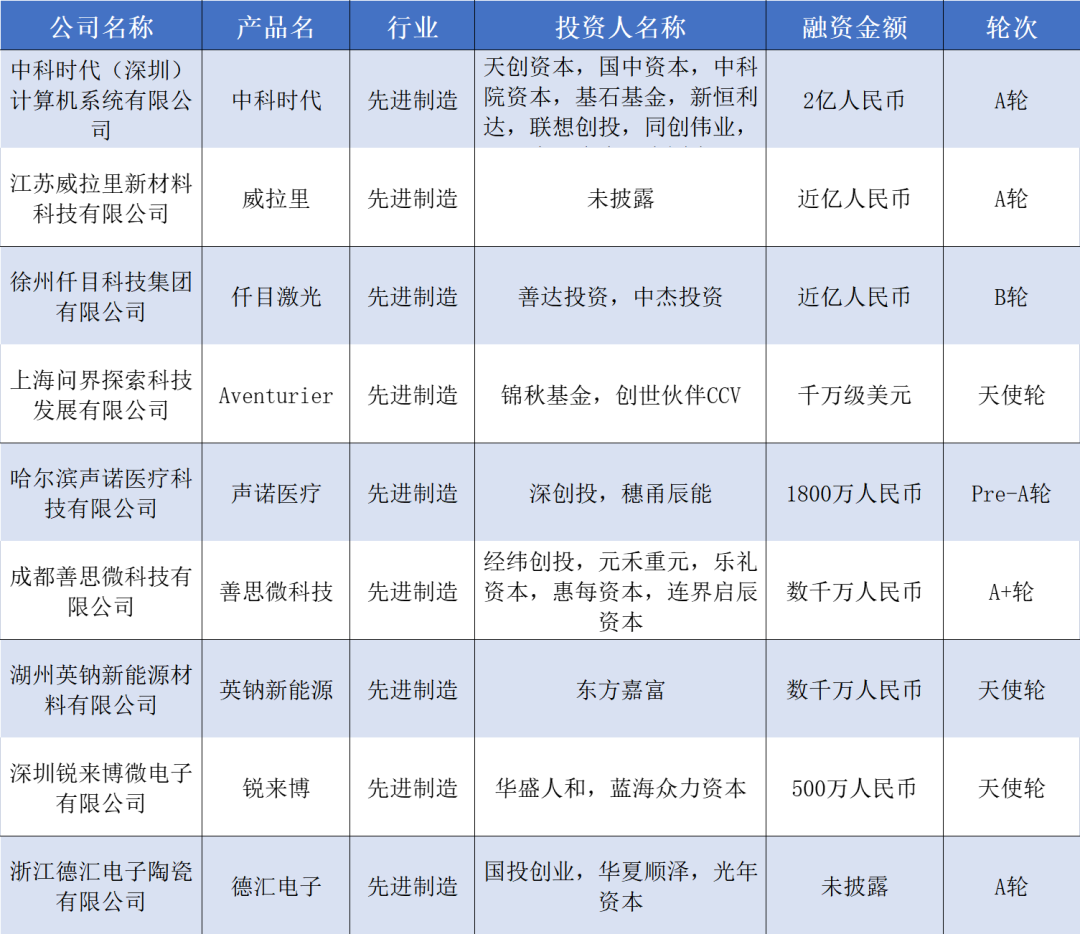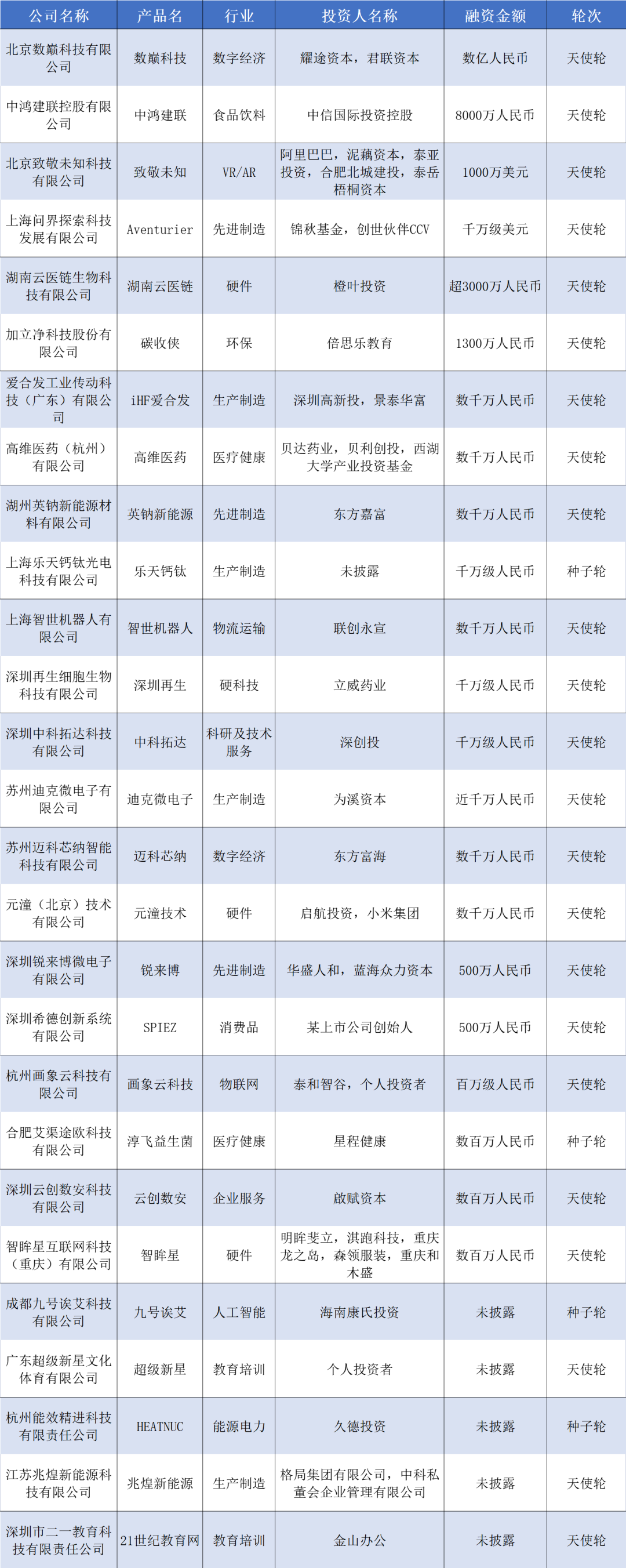 本周获得天使轮或种子轮融资的项目共有27笔,其中包括数字经济、食品饮料、VR/AR、先进制造、硬件、环保、生产制造、医疗健康、物流运输、硬科技、科研及技术服务、消费品、物联网、企业服务、硬件、教育培训、人工智能等行业。