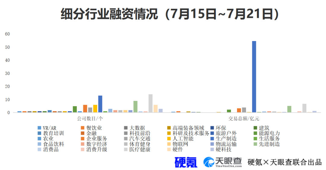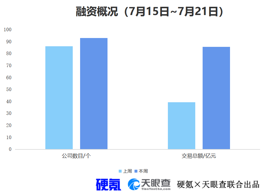 本周(7月15日~7月21日)全国共发生93起融资事件,较上周同比上升8.1%;近一周披露的交易总额约85.61亿人民币,较上周39.4亿人民币同比上升117.3%。