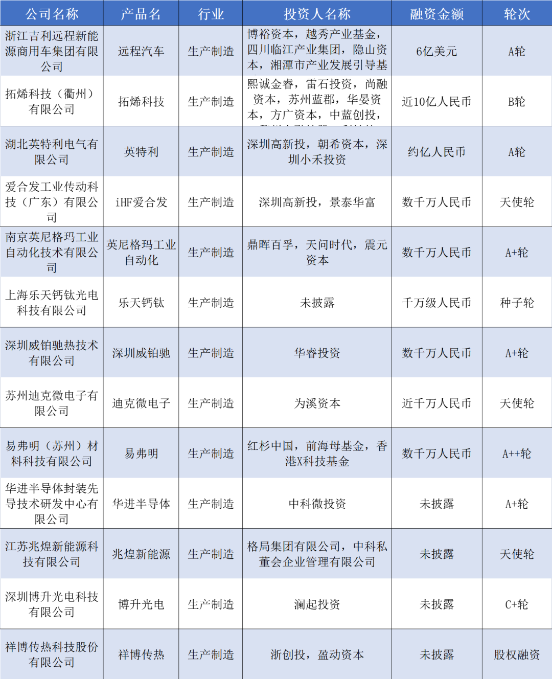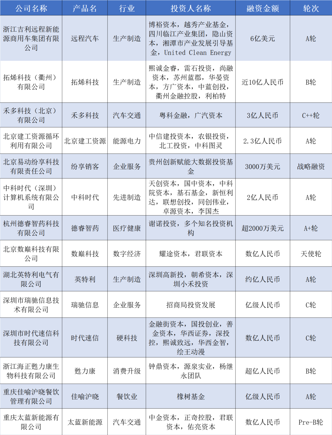 本周融资金额过亿的交易共有14笔,集中在生产制造、汽车交通、能源电力、企业服务、先进制造、医疗健康、数字经济、硬科技、消费升级、餐饮业等行业。