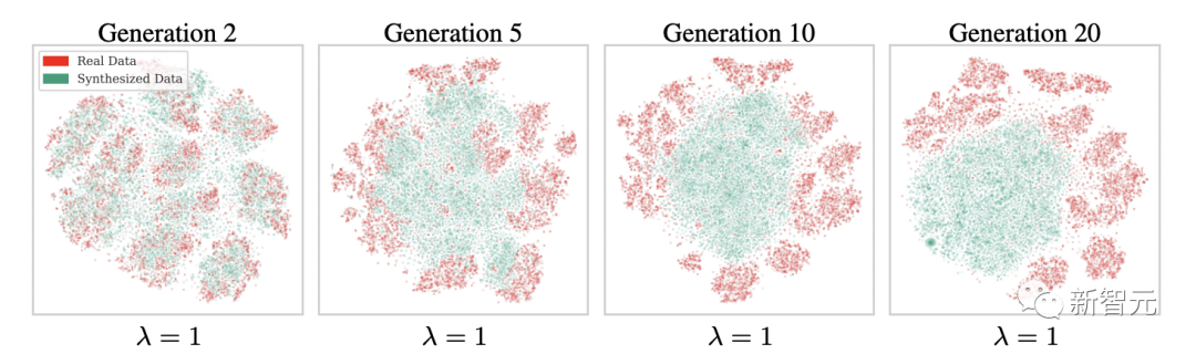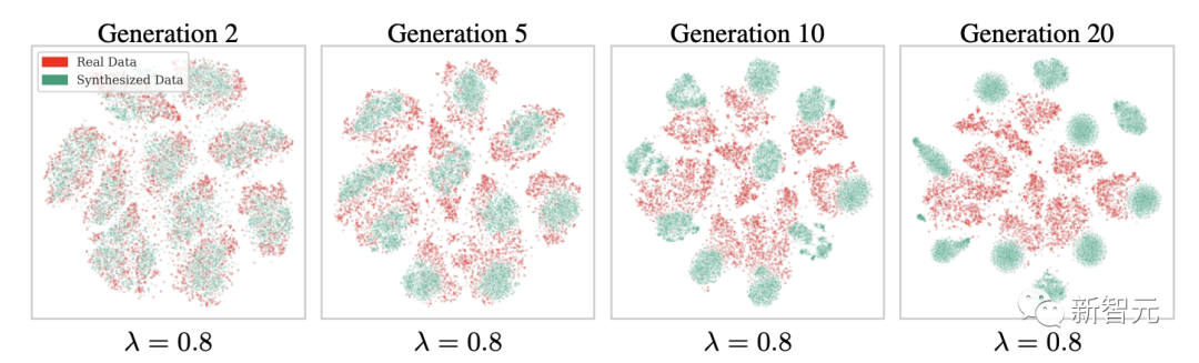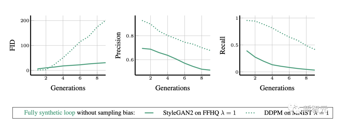 在全合成循环中,生成的合成FFHQ和MNIST图像的FID、精度和多样性(召回率)研究者给出了MNIST的真实数据和合成数据的t-SNE图,这些数据来自没有采样偏差的全合成环路(λ = 1)。可以看到,生成的模式逐渐合并,相互之间失去了分离。到第10代,生成的样本几乎无法辨认。![]()
