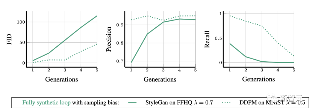 不同的自噬环变化取决于,现有的真实数据和合成数据如何组合到未来的训练集中。比如,研究者或算法通常会通过手动「挑选」合成数据来引入采样偏差,以权衡感知质量(即图像/文本看起来来不错)与多样性(不同类型图像/文本)。研究者介绍,「质量」和「多样性」两个非正式概念,分别与精确度和召回率的统计指标密切相关。如果合成数据已经存在于我们今天的训练数据集中,那么自噬循环在未来几乎是不可避免的。研究人员表示,无论训练集的组成,或采样方法如何,自噬循环对生成模型的属性和性能的潜在影响仍知之甚少。而有一点可以确定的是,使用合成数据重复训练可能会,逐渐放大任何生成模型中存在的偏差和伪影。团队研究了自噬循环的3种变体:完全合成循环,其中生成模型仅在前几代的合成样本上进行训练;合成增强循环,其中训练集还包括一组固定的真实数据;新数据循环,其中训练集还包括每一代的一组新的真实数据。所有这3种自噬循环模型的底线是,如果每一代没有足够的新鲜真实数据,未来的生成模型注定会MAD。模型实践者倾向于手动挑选合成数据,更喜欢高质量的样本,并删除低质量的样本。此外,最先进的生成模型通常具有可控参数,可以以牺牲多样性为代价来提高合成质量。研究证明,通过这种质量多样性(精确召回)权衡引起的采样偏差,对自噬训练循环的行为有重大影响。具体来讲,在没有采样偏差的情况下,自噬会导致质量和多样性的快速下降,而在采样偏差的情况下,质量可以保持,但多样性下降得更快。除了对简单多元高斯和高斯混合模型的分析和实证研究之外,团队还在正文和附录中,证明了主要结论适用于各种生成模型。在没有采样偏差的全合成循环中,完全使用合成数据训练生成模型,其合成数据的质量和多样性都会逐代下降。![]()