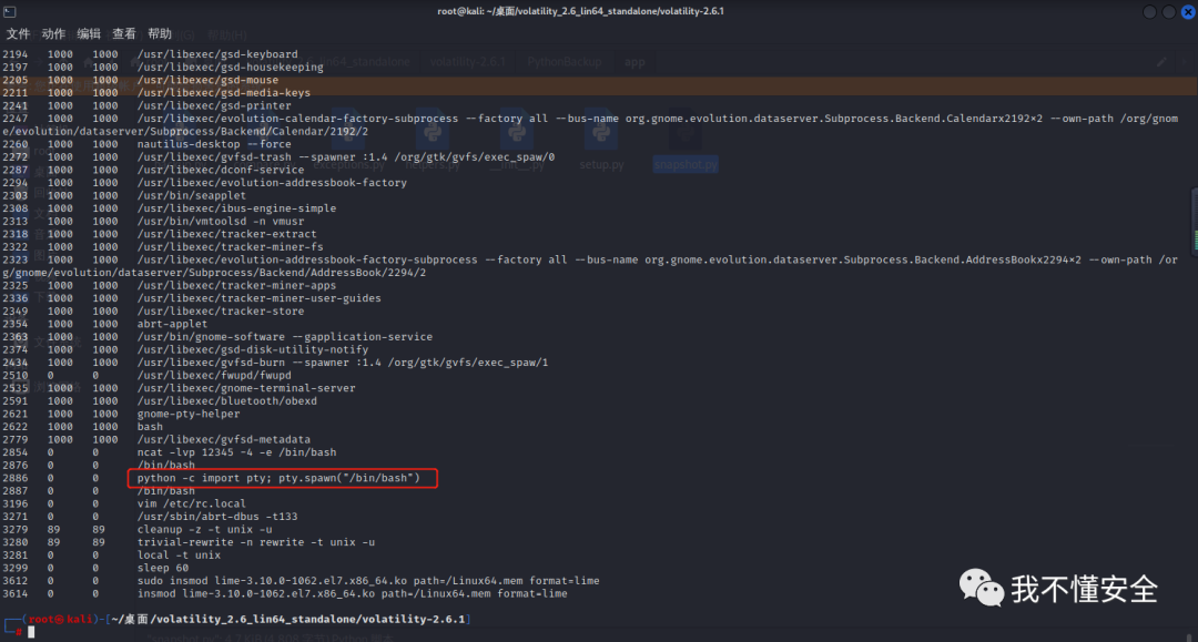 python2 vol.py -f ../c73-EZDump/dump.mem --profile=LinuxCentos7_3_10_1062x64 linux_psaux 我们可以看到,在执行了ncat命令后,执行了python -c import pty; pty.spawn("/bin/bash") 该命令,此命令允许生成新的 tty