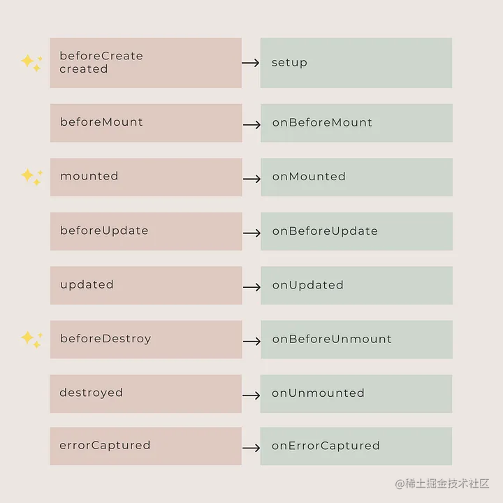 所有的组件生命周期事件都被重新命名,要么添加on前缀,要么完全改变名称。你可以在下面的图表中查看所有的变化。