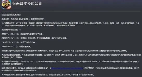 接下来是5月底,《街头篮球》手游宣布将于 7 月 25 日 11 点在中国大陆地区停止运营。
