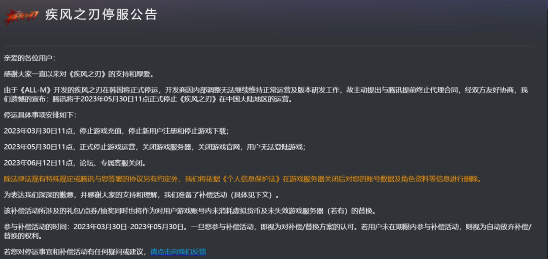 腾讯表示:由于《ALL-M》开发的疾风之刃在韩国将正式停运,开发商因内部调整无法继续维持正常运营及版本研发工作,故主动提出与腾讯提前终止代理合同,经双方友好协商,腾讯将于 2023 年 05 月 30 日 11 点正式停止《疾风之刃》在中国大陆地区的运营。