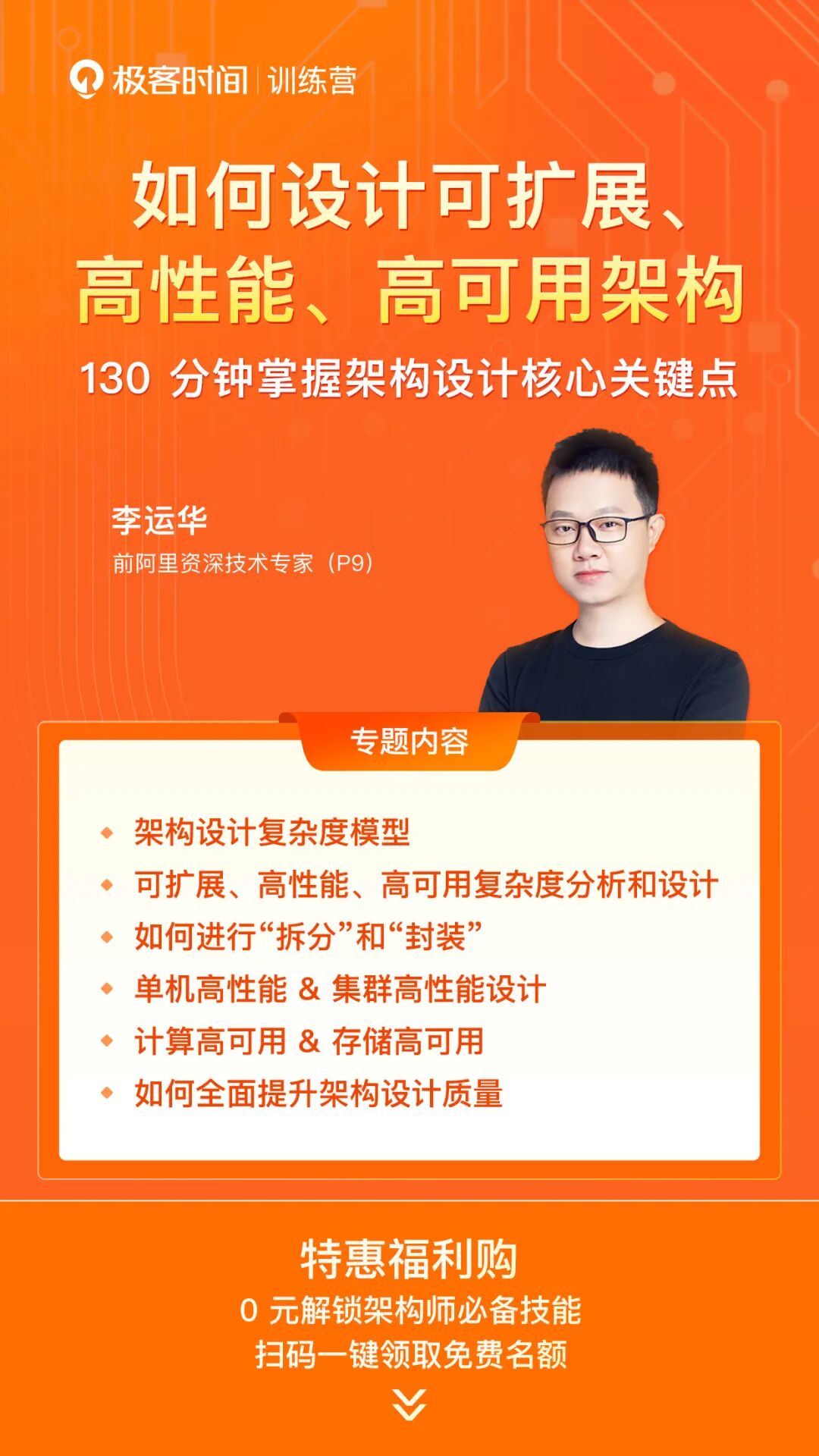 特别推荐你一个针对高可用、高性能、可扩展架构设计的专题,来自前阿里 P9 华仔,之前听过他分享的,反馈都还不错,能把架构设计讲得深入浅出、对实践有指导意义的不多,华仔算一个。现在免费,有效期就7天,抓紧码一波。