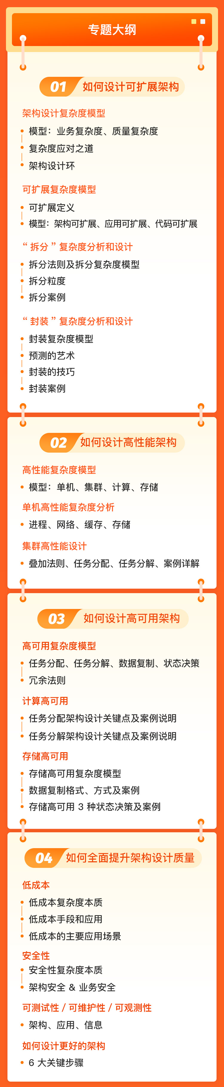 专题共计4部分,14个内容要点,聚焦高可用、高性能、可扩展架构设计,并详解阐明全面提升架构设计质量的关键要点。