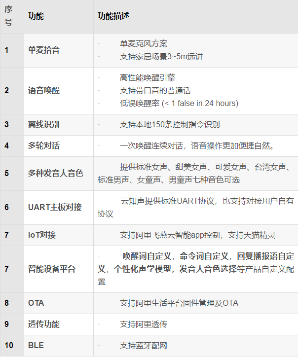 集成Wi-Fi、蓝牙、离线语音一体的AIOT模组,32bit高性能CPU,支持DSP指令集以及FPU浮点运算单元,支持FFT加速,内置RAM和ROM,丰富的外围接口,支持阿里生活物联网接入。硬件和软件功能的高度集成带来的就是成本的进一步降低。