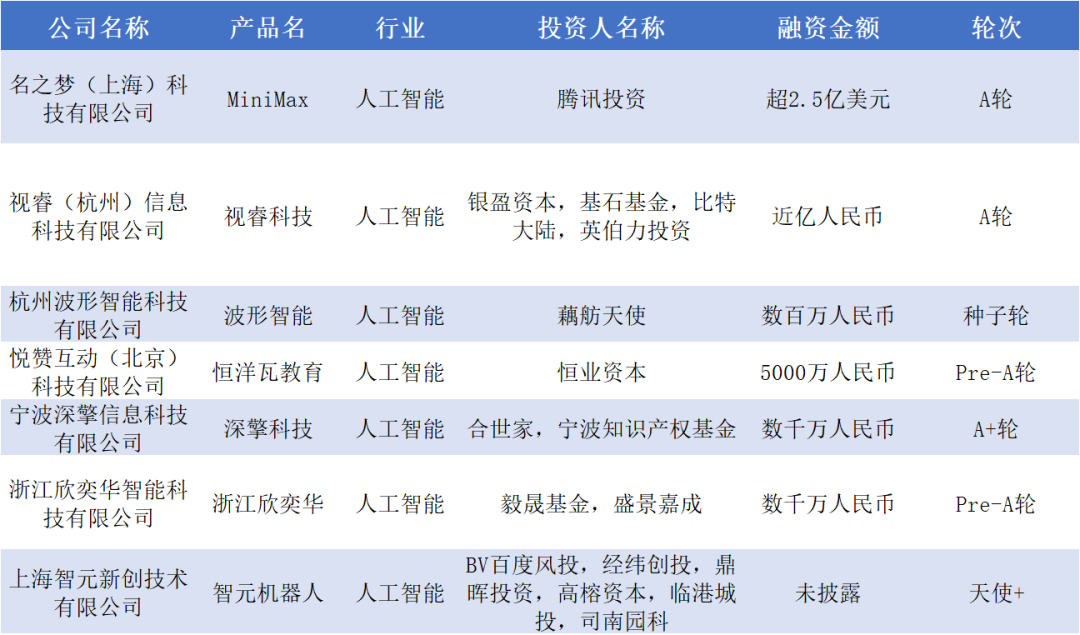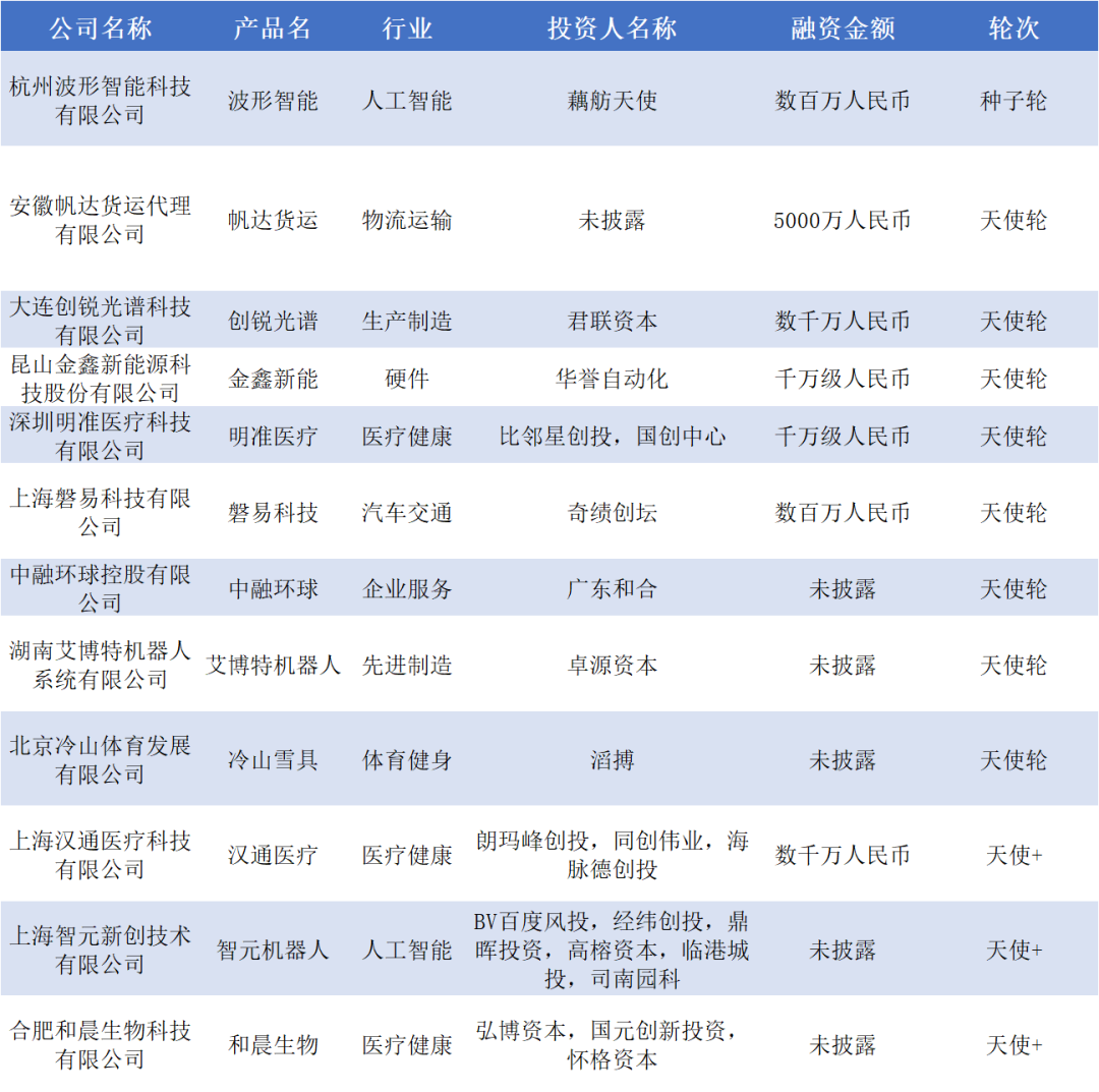 本周获得天使轮或种子轮融资的项目共有12笔,其中包括人工智能、物流运输、生产制造、硬件、医疗健康、汽车交通、企业服务、先进制造、体育健身等行业。