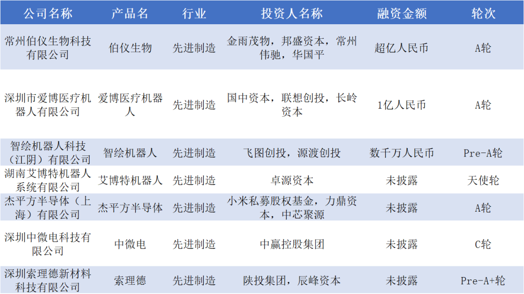 本周融资主要分布在生产制造行业;生产制造行业披露的交易总额最多,超50.53亿元人民币。