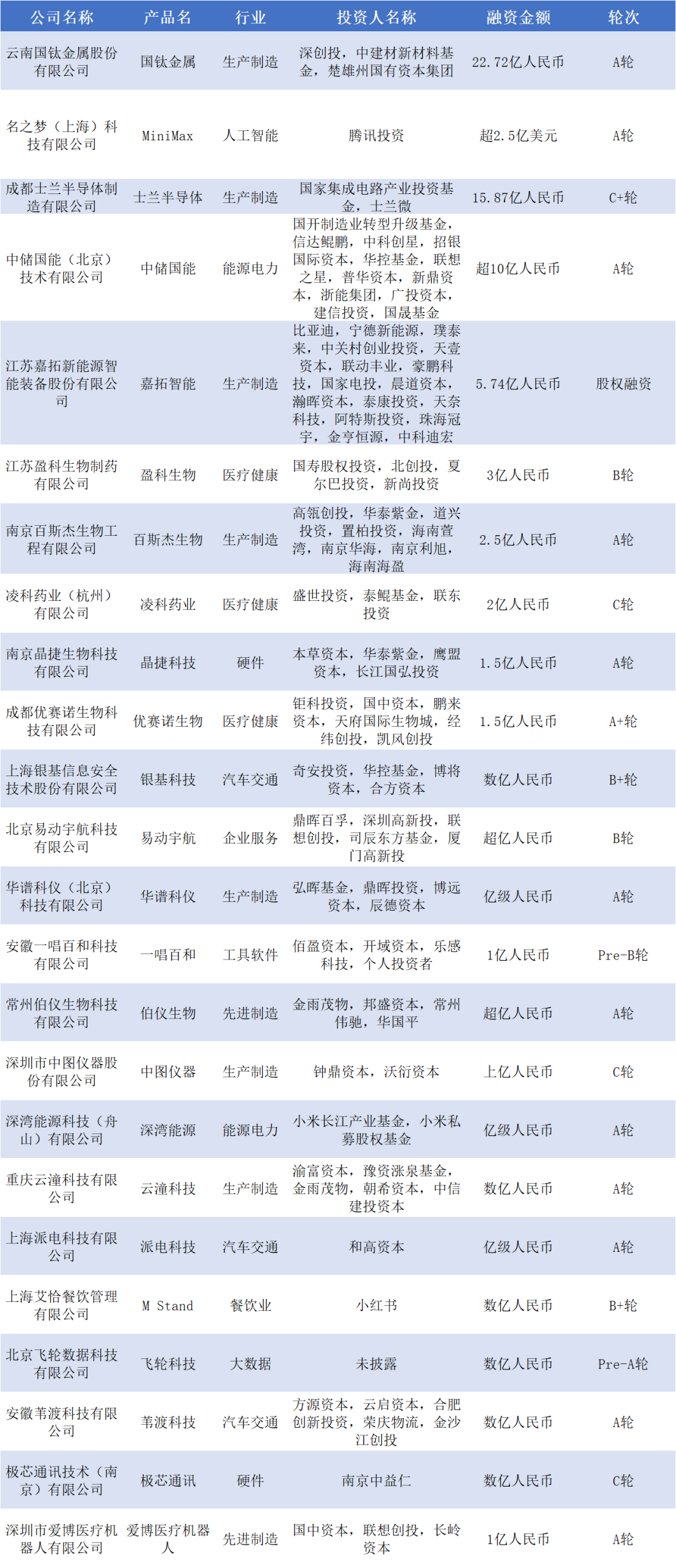 本周融资金额过亿的交易共有24笔,集中在生产制造、人工智能、能源电力、医疗健康、硬件、汽车交通、企业服务、工具软件、先进制造、餐饮业、大数据行业。