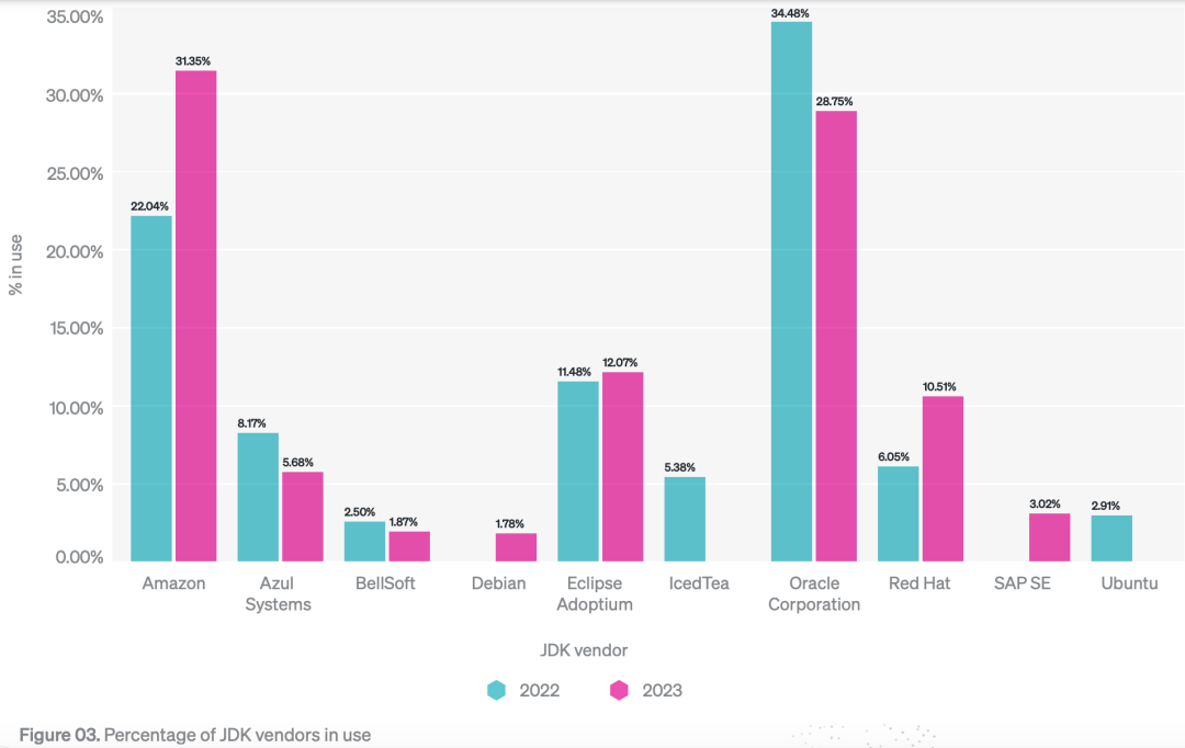 与之形成鲜明对比的是,Amazon 的使用率急剧上升至 31% 的市场份额(从2020 年的 2.18% 和 2022 年的 22%),使其成为最受欢迎的 JDK 供应商。