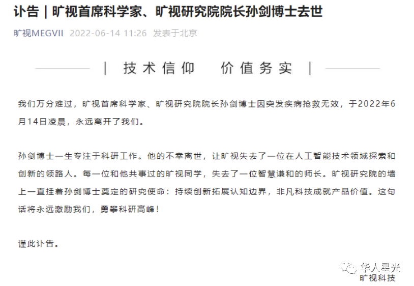 人工智能浪潮滚滚而来, 谁能踏浪而笑,屹立至高? 孙剑以领路者的姿态, 将自己化作传奇, 站在科研的巅峰, 也许他生来, 就是为了有一天叫所有人仰望, 可他的结局竟是令人万分痛心。 在旷视科技这些年, 孙剑助力国家人工智能发展, 担任西交大人工智能学院首任院长, 为社会培养了许多英才。 他的成就很伟大,人生一直很简单, 科研,运动,美食, 便是所爱的三部曲。 他运动的方式和科研一样严谨, 请教练并坚持长期健身, 还带着公司人员爬山、跑步, 孙博士的运动热情, 叫研究员是“苦不堪言”, 在电脑上发出抗议:“我不要举铁!” 休闲之余, 他会带着大家一起寻找美食打卡, 还会晒一些美食照片, 其中一些出自妻子之手, 比如无敌酱爆什锦菜, 他的评价是原料多得数不过来。 和他在一块做研究也好, 团练也好,吃饭也好, 大家都能感受到他的极具人格魅力。 研究员说, 和他一块工作是很好的氛围, 午休灵活不加班。 他总是帮助年轻人,给机会, 鼓励年轻人发论文,做学问。 可是这样好的一个人, 走得是那样的突然。 旷视科技发布的讣告,