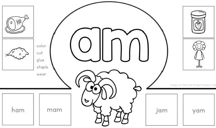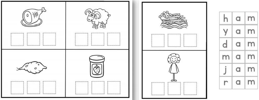 用字母拼单词,孩子们通过剪掉字母并将它们粘贴到正确的空格中来构建单词;