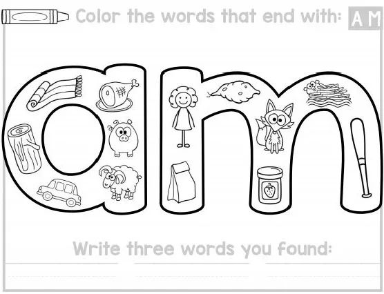 查找并涂色,孩子们找到具有相同结尾的单词涂色,然后写下他们找到的三个单词;