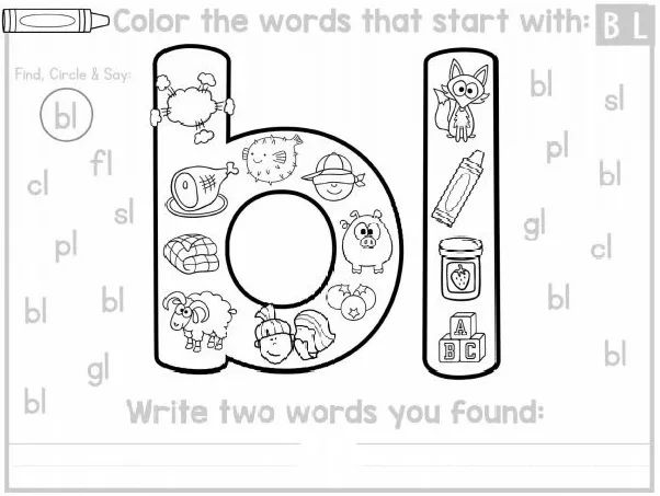 查找和涂色,孩子们会找到具有以辅音字母组合开始的单词并进行涂色,然后写下他们找到的两个词;