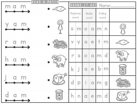 星期二拼读练习,复习每个字母及其在单词中的发音,在右侧的练习中,把单词分成开始、中间、结尾三部分,组合成正确的单词,并且拼读出来;