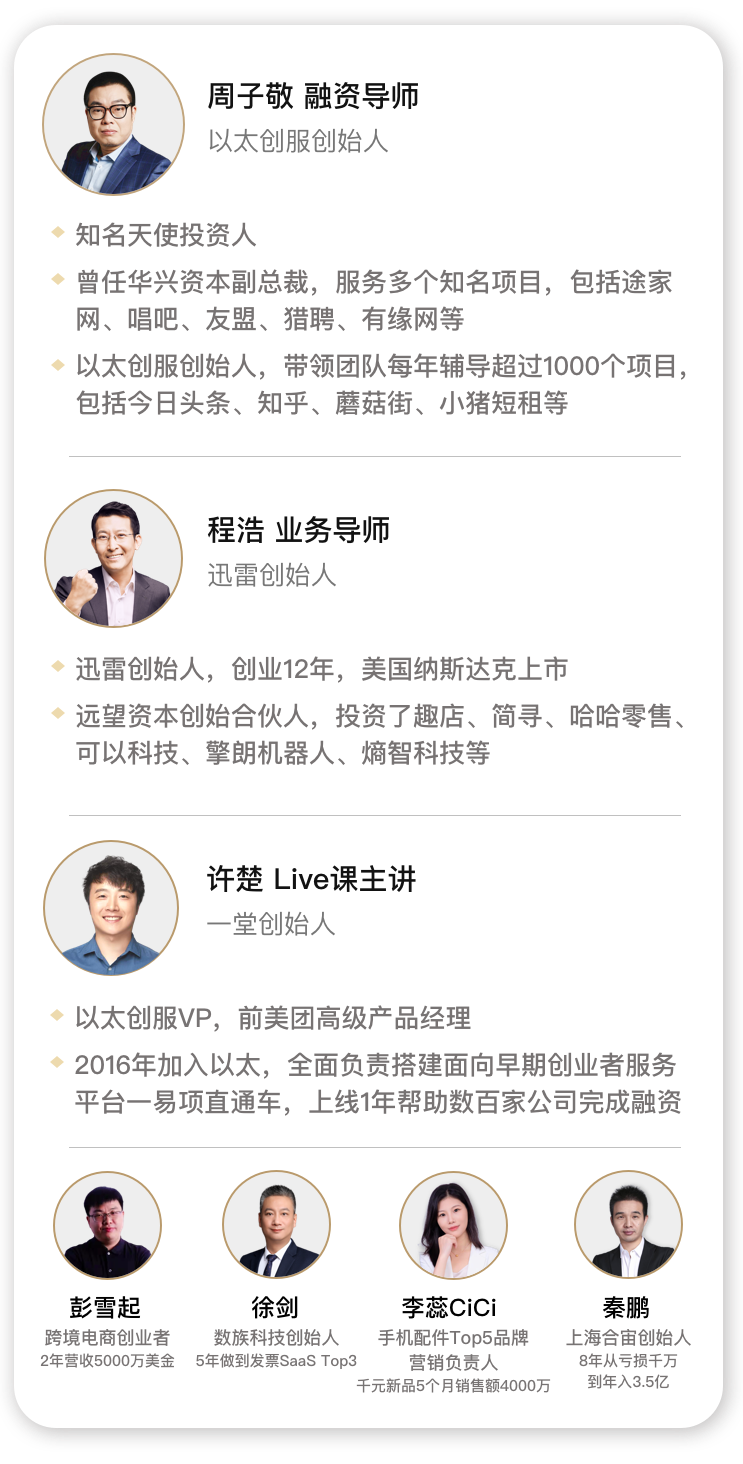 课程由诸多独角兽幕后投资人周子敬、迅雷创始人程浩等30多位业内一线专家亲自授课。