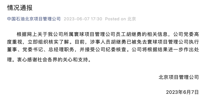 6月7日,中国石油北京项目管理公司发布情况通报:根据网上关于我公司所属寰球项目管理公司员工胡继勇的相关信息,公司党委高度重视,立即组织核实了解。目前,涉事人员胡继勇已被免去寰球项目管理公司执行董事、党委书记、总经理职务,并接受公司纪委核查。公司将根据结果进一步作出处理。(极目新闻)