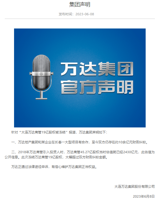 万达集团回应“19亿股权被冻结”:正通过法律途径申诉