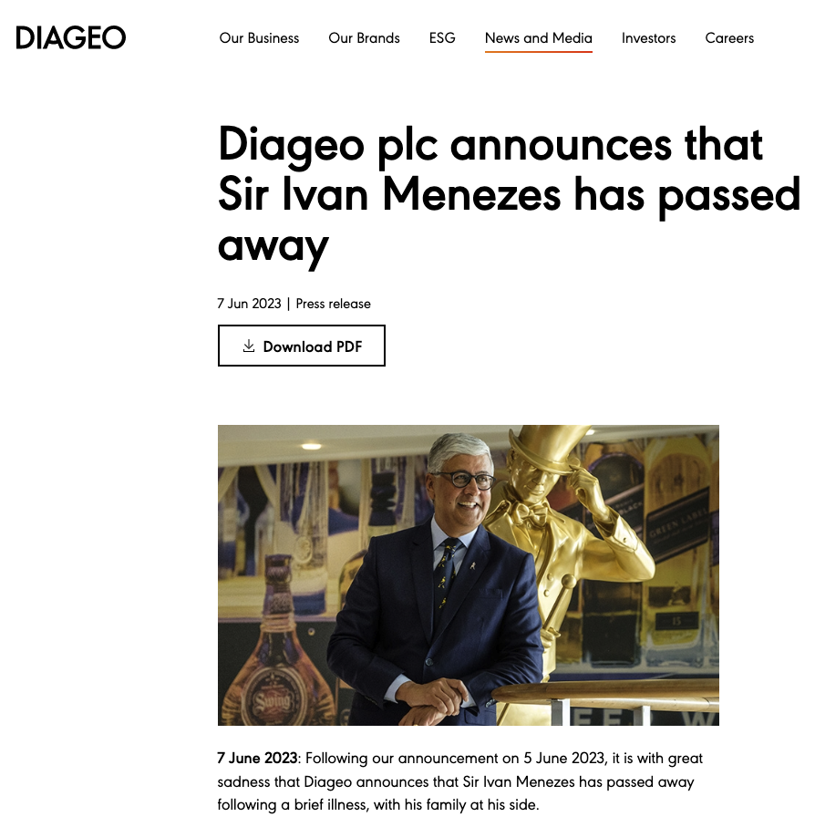 6月7日,国际酒业巨头帝亚吉欧官网宣布,首席执行官孟轶凡(Ivan Menezes)因病去世。此前一天,这家全球最大的烈酒公司表示,原定于本月底退休的孟轶凡因胃溃疡等疾病在医院接受治疗,候任CEO黛布拉·克鲁(Debra Crew)将立即临时担任最高职务。现年63岁的孟轶凡为英裔美国人,出生于印度西部城市浦那,1997年参与创立帝亚吉欧。(界面新闻)