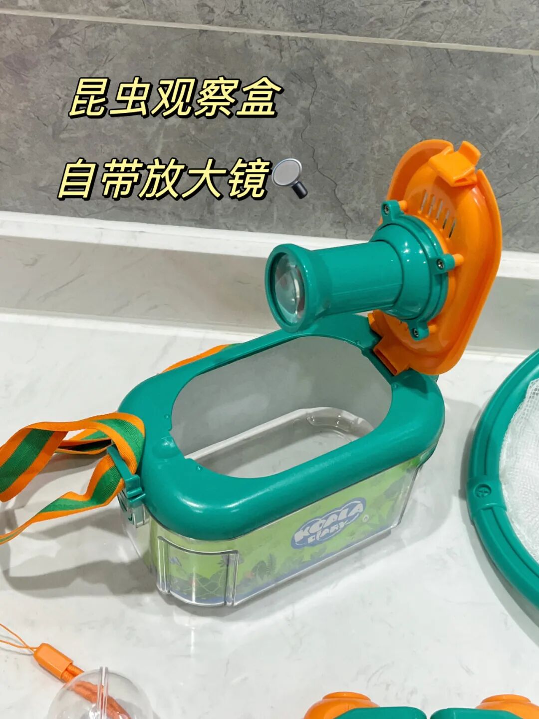 这个大的观察舱,在盒盖处安装有放大镜,盒底处有昆虫,方便孩子观察细节。