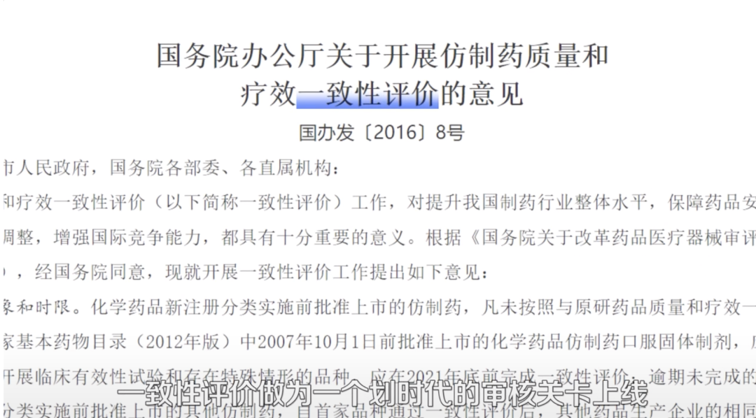 终于在2016年3月5日,一致性评价做为一个划时代的审核关卡上线,相当于给药品划了一条70分的分数线,一致性评价通过的才是优等生,并且一个药物只要首家通过,其他生产企业在两年内没有通过一致性的,将来通通不允许再进入市场。