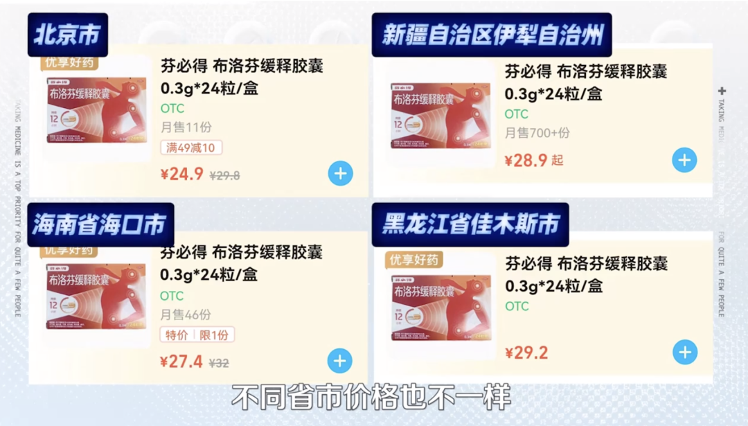 拿布洛芬举例,三甲医院是一种价格,在不同连锁品牌的药店又是一种价格,不同省市价格也不一样,不同品牌价格更不一样。
