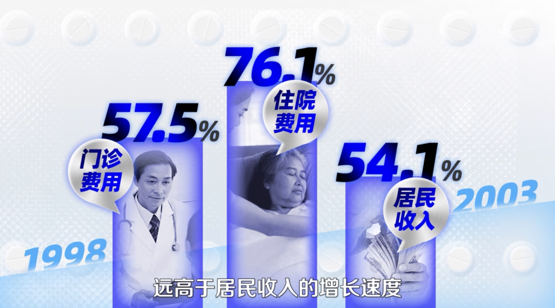 巨额的药品回扣悬在头顶,患者已经不堪重负,从1998到2003年,患者平均每次门诊费用上涨了57.5%,住院费用上涨了76.1%,远高于居民收入的增长速度。