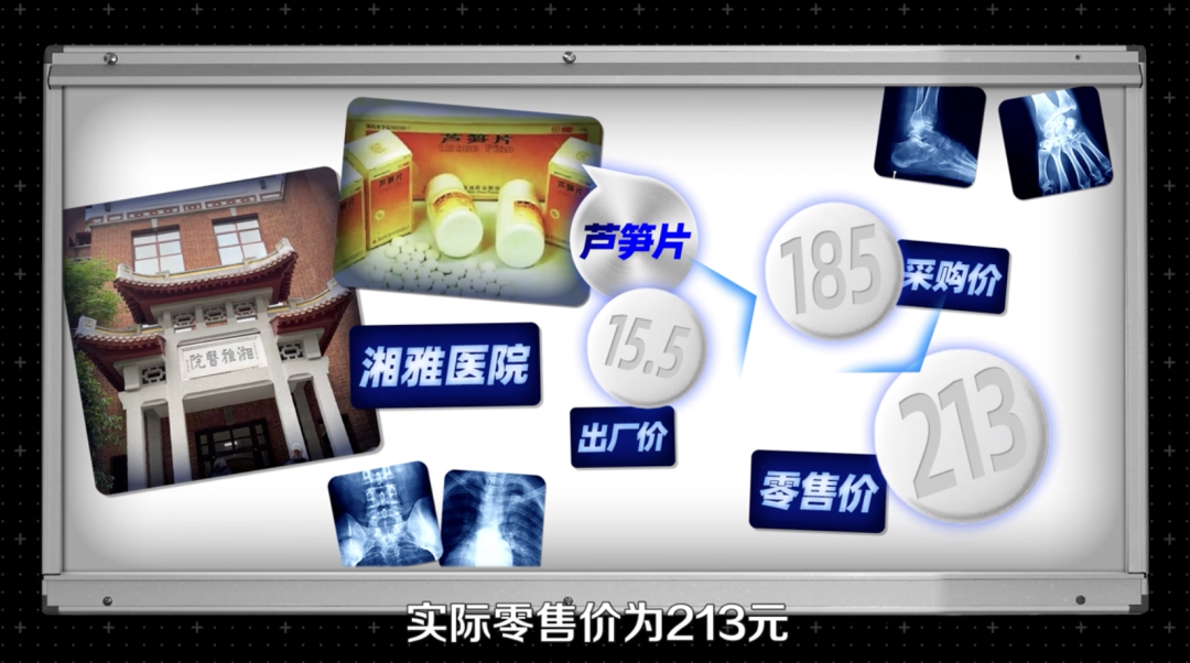 但药品行业发展到今天,可以说充满了波折,湘雅医院一款叫“芦笋片”的药,出厂价为15.5元,招标采购价为185元,实际零售价为213元。