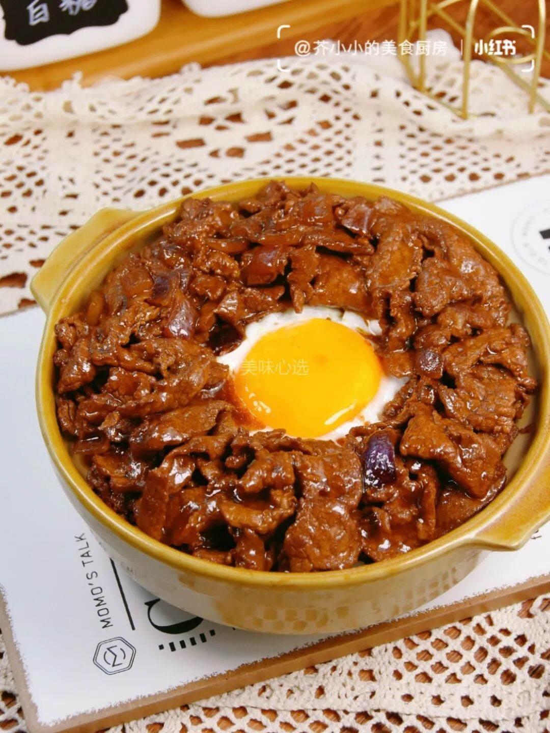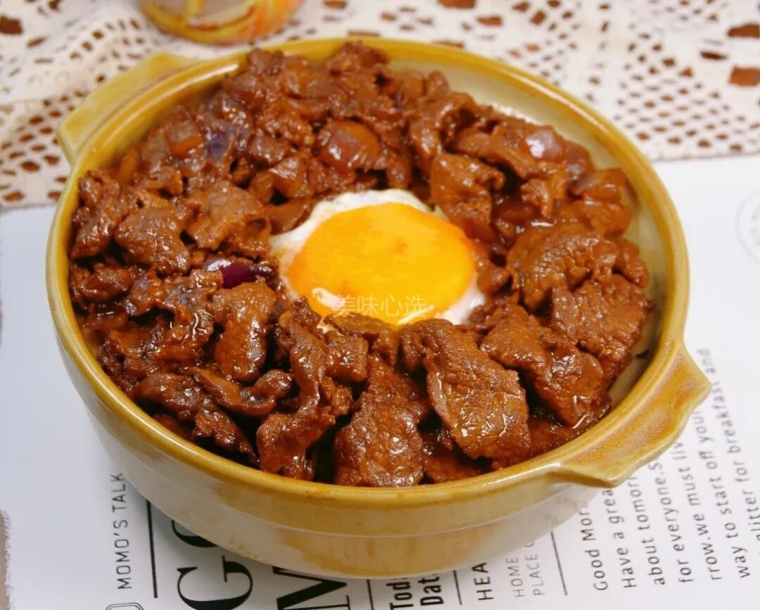 ④煎个糖心蛋和牛肉一起盖在米饭上面完成