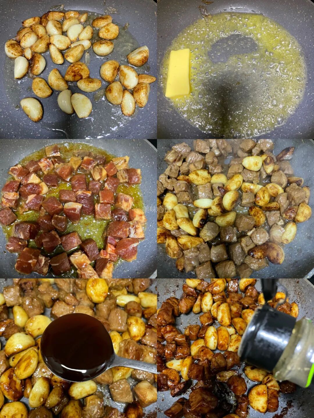 ③锅内放入一块黄油融化,倒入蒜粒和牛肉粒翻炒,加一勺蚝油➕一勺砂糖➕