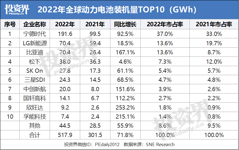 据SNE数据, 2022年全球动力电池装机量排名前十的企业中,我国有6家企业上榜,总装机量合计占全球市场的60.4%,相较于2021年增长了12.2%,在全球动力电池市场中占据绝对主导地位。