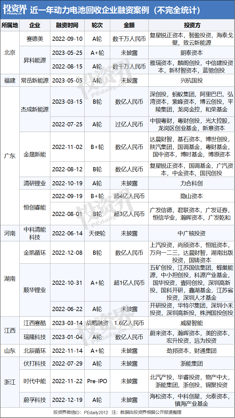 投资界VC情报局根据公开数据不完全统计,近一年动力电池回收领域融资事件23起,且呈上升趋势,越来越多投资人加入这场动力电池淘金之旅。