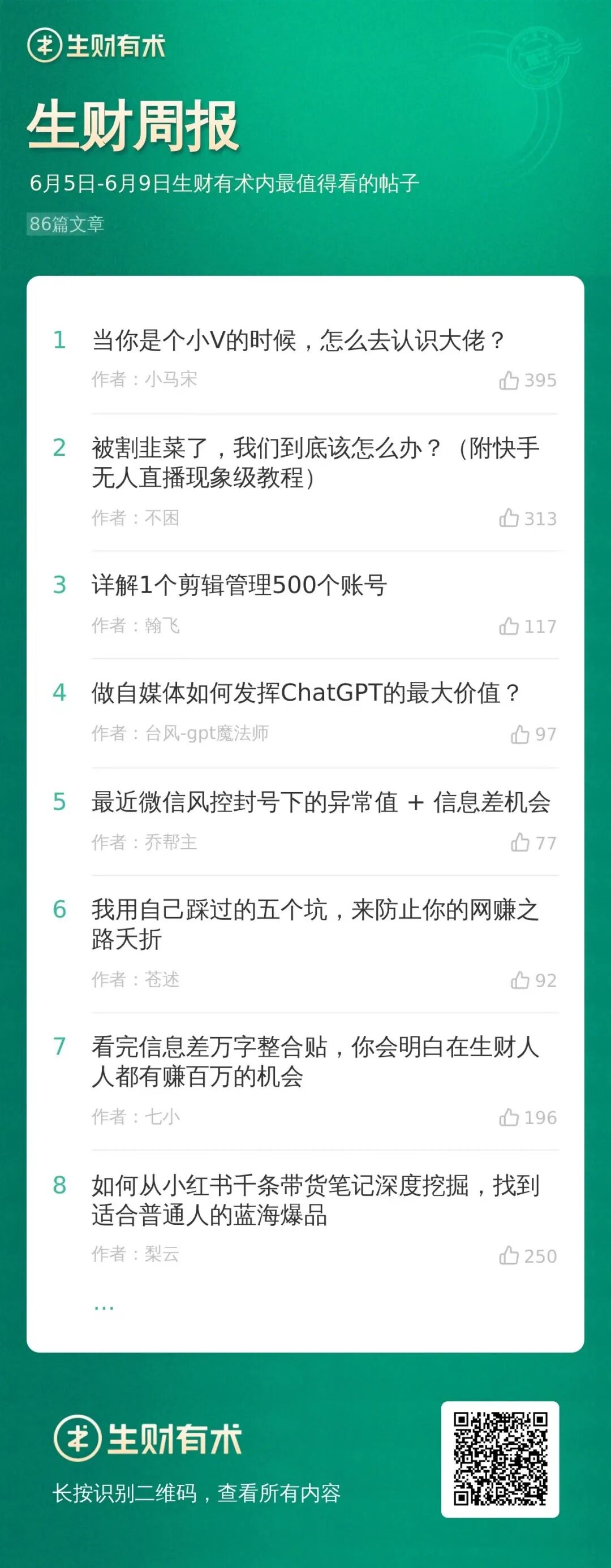以上,便是本期生财周报的全部内容,圈友可点击「阅读原文」查阅生财周报,原帖里附带对应内容的链接,可直接跳转。