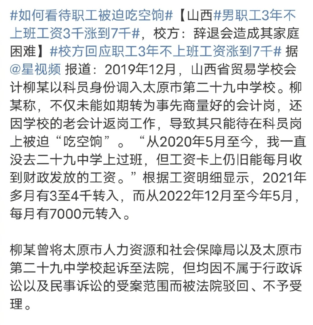 山西省贸易学校会计柳某3年前调入市29中,却因老会计返岗“被迫”吃空饷3年,这3年中工资却从3千涨到了7千,实现了不上班还有钱赚的梦想。